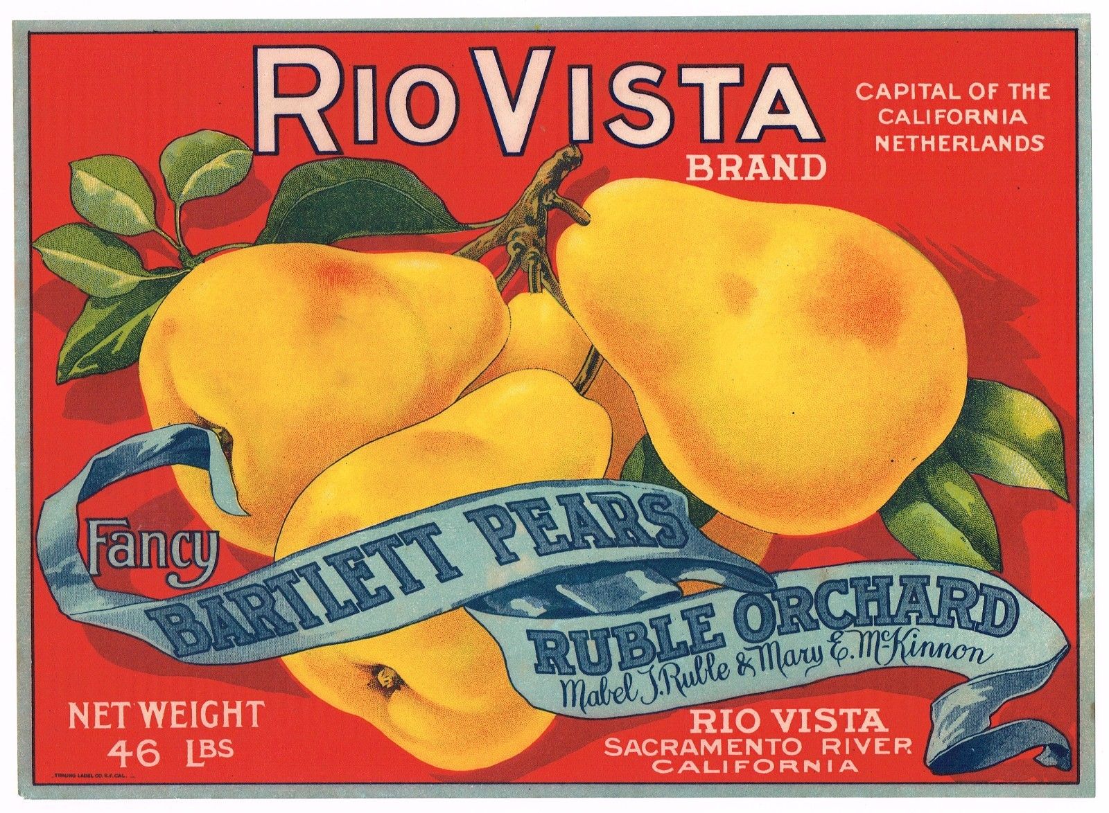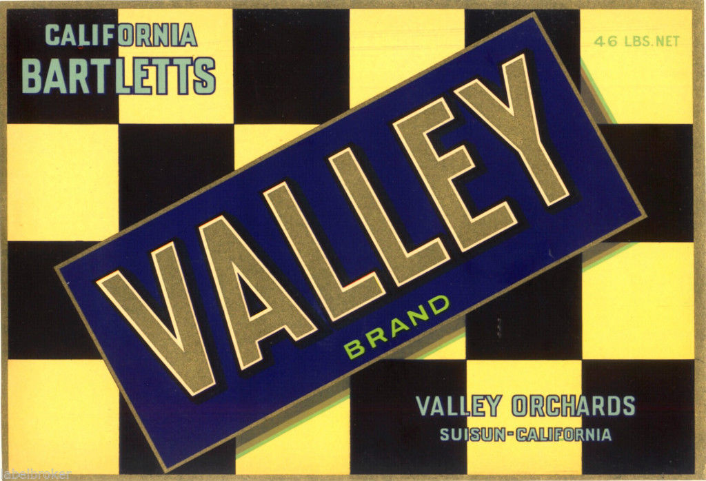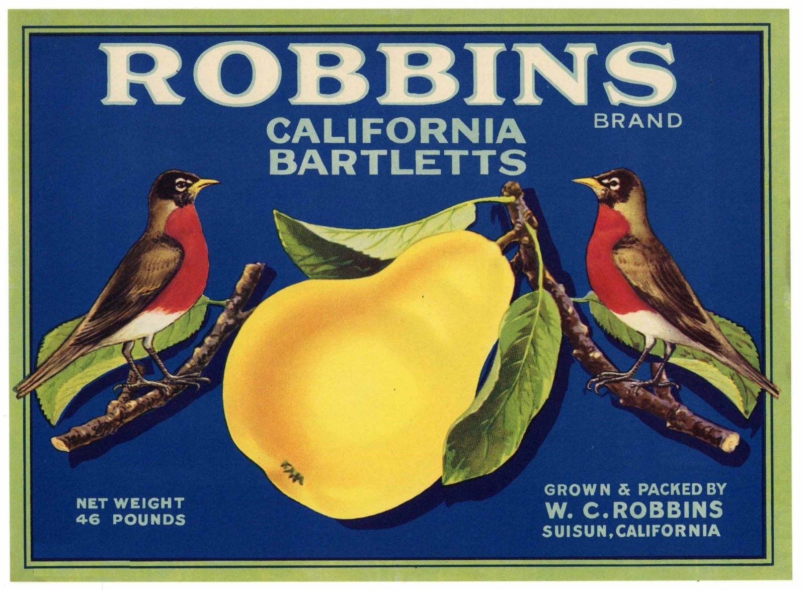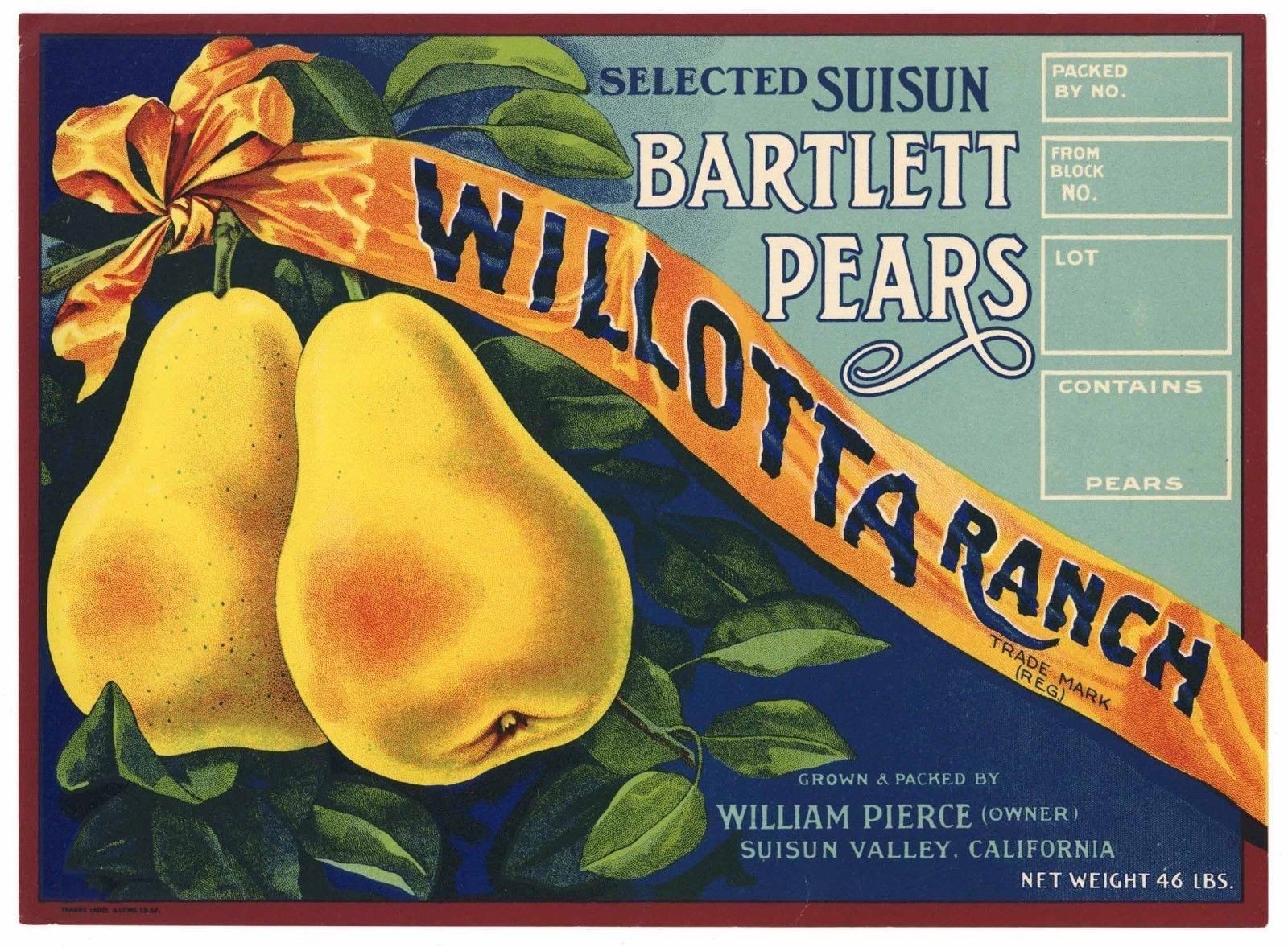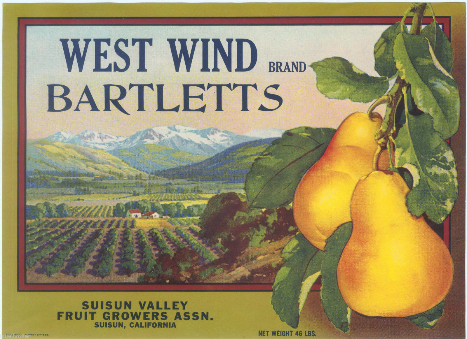 Fruit trees, especially those for Bartlett Pears, and to a lesser extent Bing Cherries, were the main crop grown in the Suisun Valley from the late 1880s to the early 1970s when wine grape vineyards began appearing. This was before cardboard boxes were widely used, and fruit packing houses, like the Suisun Valley Fruit Growers Association, would ship their produce in wooden boxes, with labels glued on the ends to identify where the fruit came from. Many of these labels were quite colorful, and they represent a fascinating part of the local history. Shown below are some historic labels from Suisun Valley, and the neighboring Vacaville and Rio Vista areas. Clicking on any of these labels should bring up a more detailed view.