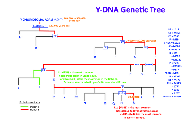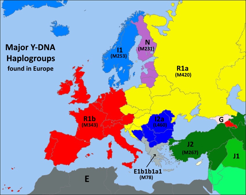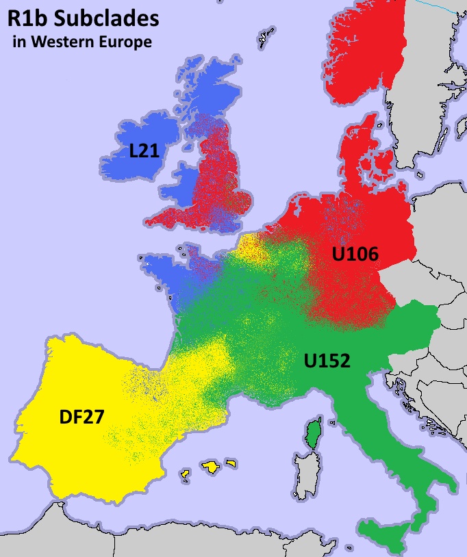 Men contain within the DNA molecule of their Y chromosome thousands of basic, functional units that are known as genes. Some of these genes determine physical traits, such as eye color, whereas other genes may control body functions. However, most genes appear to do nothing at all. Alleles are simply variants of genes, such as variants of the genes that control eye color, and they result from the presence of inherited mutations. In other words, alleles are alterations of the original gene that evolved over generations. Although the mutations that transform genes into alleles are infrequent, and therefore rare, they account for much of human diversity. Also, because the mutations that create alleles are subsequently passed down from parent to child over the generations, they form a genetic record that we can use to characterize haplogroups. "Haplotypes" are genes and alleles that tend to be inherited as a single group by people sharing the same ancestry. Haplogroups differ from haplotypes in that they are larger, more inclusive units containing one or more haplotypes. For example, a haplogroup would include not only a given haplotype, but also the parent haplotype that it evolved from, its grandparent haplotype, and so on and so forth going all the way back to the defining haplotype of Haplogroup L1085, which is the haplotype from which all subsequent hapotypes probably diverged, and which probably evolved more than 140,000 years ago. Mutations not only transform genes into alleles, but they also change one haplotype into another. Thus, the presence or absence of certain mutations form the basis by which different haplotypes are identified. These mutations are known as "single nucleotide polymorphisms", or "SNPs". Thus, identifying the SNPs in a sequence of DNA is how we identify haplotypes, in order to ultimately characterize haplogroups. Another way of looking at SNPs is to consider them as locations on a DNA molecule where the composition has changed. In other words, an SNP is where a mutation has taken place. A DNA molecule is shown on the right, and it is made up of building blocks called nucleotides, of which there are four - Adenine, Thymine, Cytosine and Guanine. Each nucelotide is joined to another to form a "base pair", and the simplest way to create a mutation, and thereby also create an SNP, is to simply remove one of the "base pairs" from the DNA molecule. Haplogroups also represent branches on a "Y-DNA genetic tree". The so-called "Y-chromosomal Adam", who is the common ancestor of all men alive today, sits at position A0 at the top of this tree. Then branching down from him are the haplogroups of all living men. Because members of a haplogroup share a common ancestor, the haplogroup branches on this tree are also clades and subclades, where a clade is a major branch, and subclades are minor branches below clades. Branching down from Y-DNA Adam is the R1b branch (Major Haplogroup M343), which is the clade that most people in Europe belong to. Then branching down from M343 is the M269 Haplogroup, which is the R1b subclade that is most common in western Europe. Continuing down from M269 is the L21 Haplogroup, beneath which are various Irish and Scottish haplogroups (L21 subclades), some of which we discuss more fully under "Celtic Haplotypes of Ireland". The maps below show the major haplogroups found in Europe today, and the most common subclades of the R1b Haplogroup.
