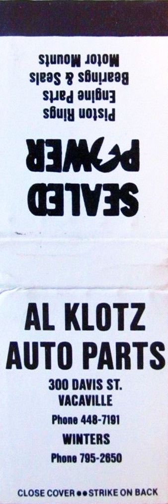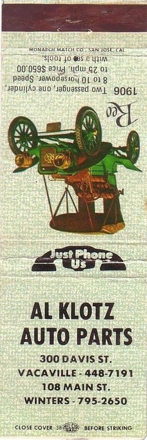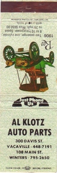 "Al Klotz Auto Parts" occupied the west side of the Triangle Building, at Dobbins and Main, where Schaffer’s men’s clothing store had onve been. George Lynn's firm, J.C. Insurance, was in the middle of the building, and James Miller’s Drug Store, and later the Vacaville Drug Company, was the tenant on the east side. Although parts sales were the mainstay of Al’s business, he still kept a machine shop in back for engine repairs. He and George Lynn later bought out their partner's interest in the building, and Al eventually bought out George.