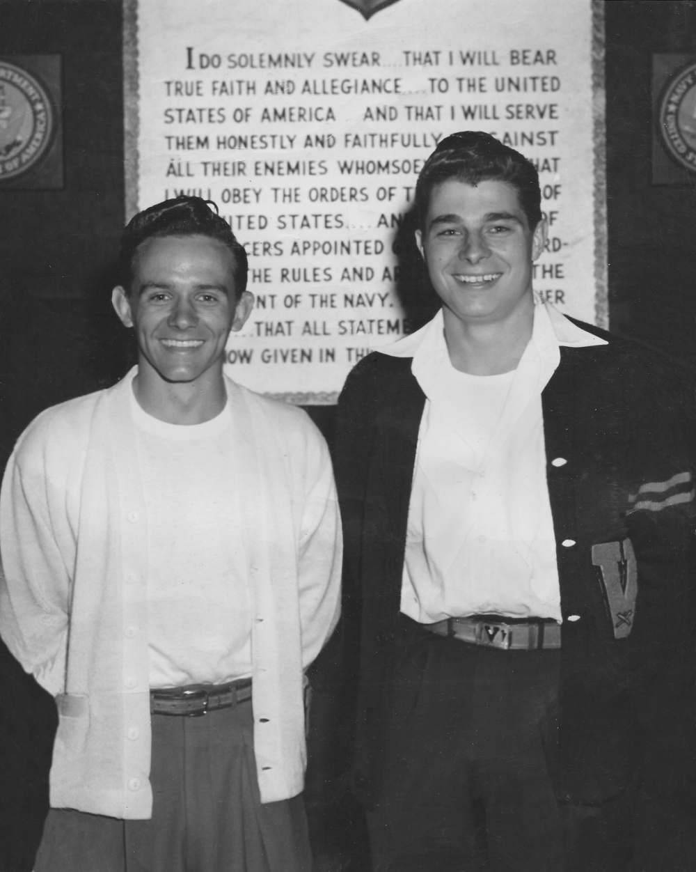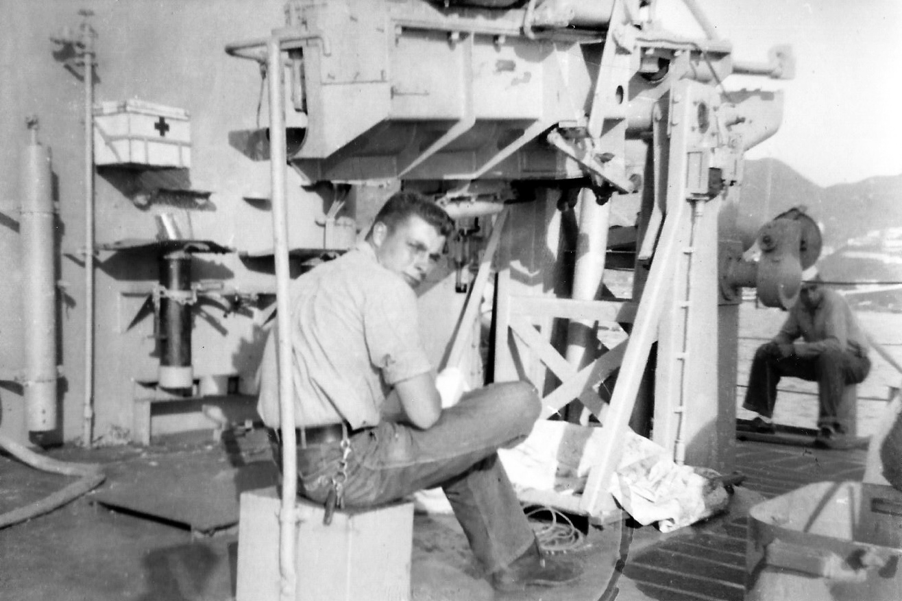 Left: Randy and a friend enlisting in the Navy. Right: Randy on board the U.S.S. Ulvert M. Moore in May or June 1951 in Hong Kong.