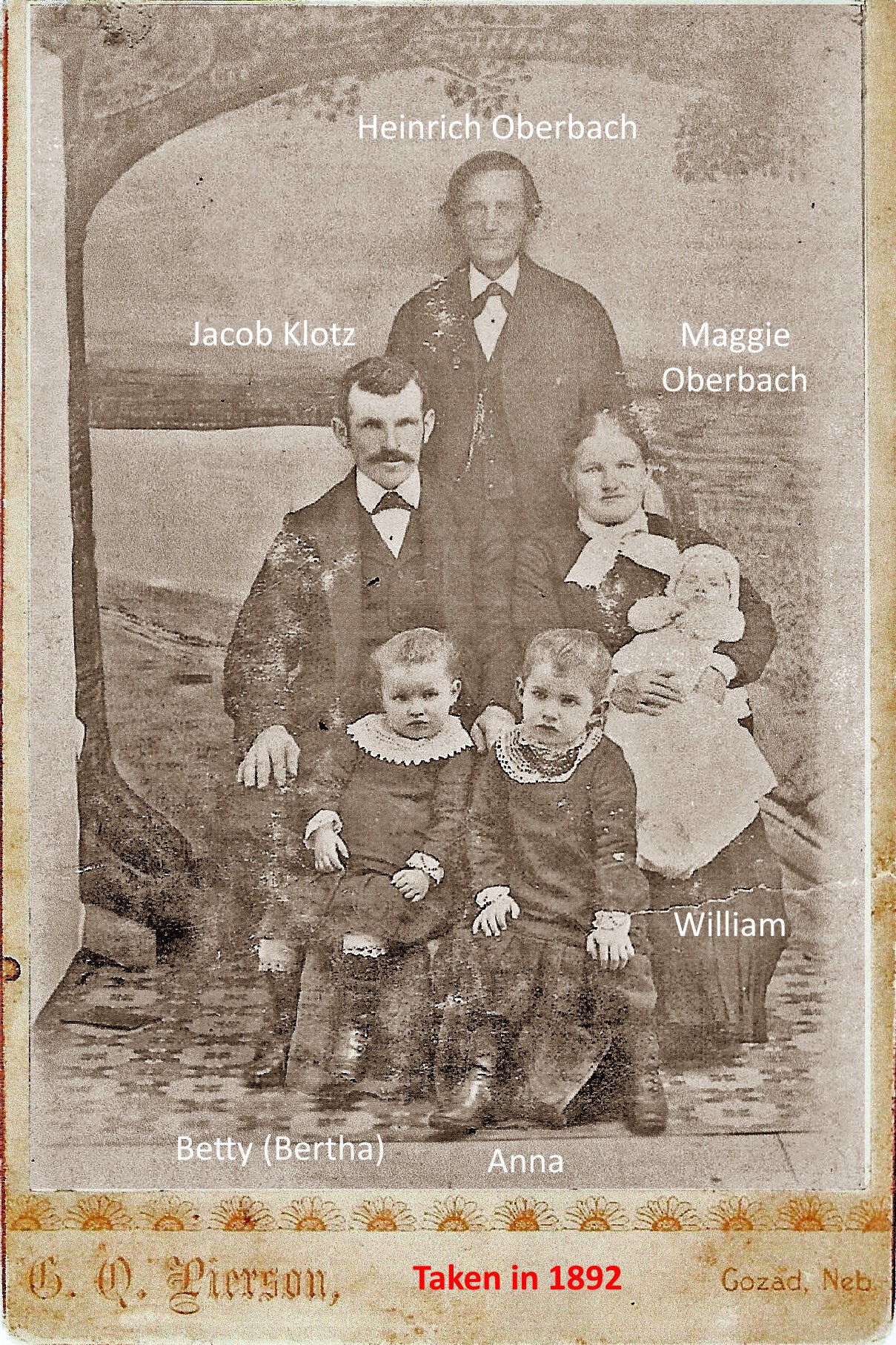 Interestingly, a first cousin of Jacob's, named David Klotz (1872-1949), arrived about 1904 in Eustis, Nebraska with his wife and two children. This David is not to be confused with Jacob's younger brother of the same name. Cousin David remained in Eustis, where he is buried with his wife and four children in the local Eustis East Cemetery - Albert (1899-1944), George (1900-1964), Fred (1904-1996) and Emma (1909-1995). Cousin David probably came to Eustis because of his connection to Jacob, but no details on their relationship have been found. None of David's children appear to have had children of their own.