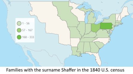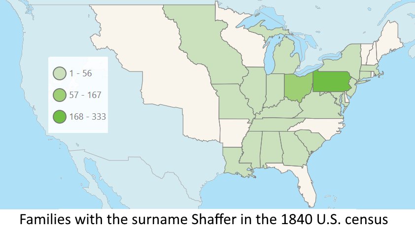 * Frank Shaffer's grandparents John Shaffer (b. c.1815) and Delilah Dearth (c.1820-1883) were born in Pennsylvania, and came about 1840 to Ohio. Then they moved after the end of the Civil War to California, and settled in Yreka. Their parents and ancestry are not known, but the Shaffer surname is said to have originated in Hesse, Germany. Many Shaffers immigrated from Hesse to Pennsylvania in the early 1800s, and more families with the Shaffer surname (333 families total) lived in Pennsylvania during the 1840 U.S. census than anywhere else in the U.S. (see the U.S. map above)
