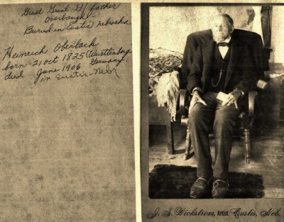 Remaining in Sheridan County, Wyoming were Heinrich's daughter Anna Schreibeis and her family, and also daughter Carrie, who married George Smith, and had several children of her own. Daughter Maggie Klotz and her family moved on to Whatcom County, Washington with Heinrich's daughter Barbara. His youngest son Jake Overbaugh ended up settling in Nome, Alaska. Heinrich, Sr. remained several years in Wyoming, where citizenship papers for him that are dated Nov. 3, 1896 are on file in the Sheridan County courthouse. However, he went back at some point to Eustis, Nebraska, presumably to be near his daughter Katherine Durner. Heinrich, Sr. died on June 12, 1906 in Eustis, and he is buried there in the Eustis East Cemetery.