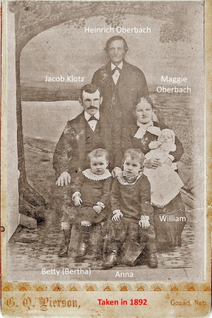 Johann Jakob Kloz, Jr. (1863–1935) was born on Jan. 18, 1863, and baptized on Jan. 21, 1863 in Oberstenfeld. He immigrated to the U.S., and married Margaretta Oberbach (1865-1901) on Sept. 4, 1887 in Cozad, Nebraska. He died on Jan. 28, 1935 in Santa Rosa, California. He is covered in more detail as Jacob Klotz in Generation II of the above lineage.