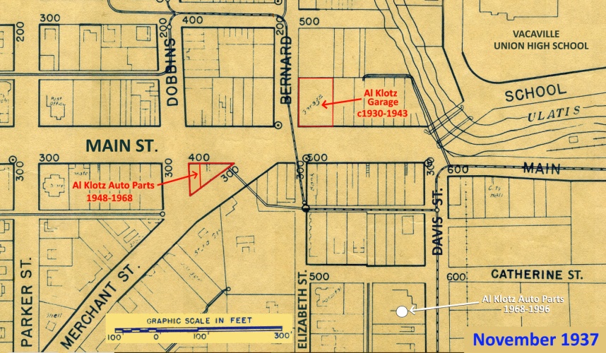 "Russell Beelard (1906-1979) launched his service station business in 1926 when he leased a Standard Oil Station on Merchant Street. [Then] in 1930 Beelard and Elmer Burton (1902-1998) went into partnership and purchased the old Vacaville Garage on Main Street.". They also opened a Buick dealership on the site. "Al Klotz leased the shop and ran it [for them] until World War II," as the "Al Klotz Garage". It was on the north side of Main Street (now Lincoln Street, back then part of U.S. Route 40), at its intersection with the old Bernard Street that no longer exists. There was a gas station in the front half of the lot, with the garage in the rear (Limbaugh and Payne, 1978, p. 217; Randy Klotz, pers. comm., 2019). Today the Pure Grain German Bakery in the Town Center Mall sits near where the garage was located.