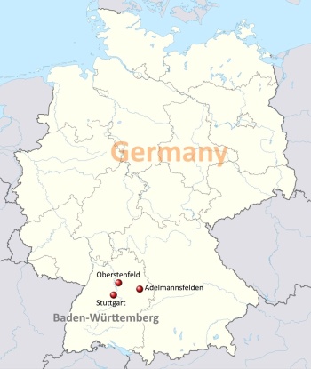 Heinrich "Henry" Oberbach (1825-1906), the maternal grandfather of Al Klotz (1901-1999) of Vacaville, was born on Oct. 21, 1825 in Adelmannsfelden, which is a town in the Baden-Württemberg province of Germany that is located about 40 miles northeast of Stuttgart. He was baptized there two days later on Oct. 23rd in the local Protestant (Evangelisch) church of Adelmannsfelden. His parents are listed on his baptism record as Karl Oberbach (1797-1854) and Margarethe Roether (1801-1871), who were married on Feb. 16, 1824 in Adelmannsfelden. Their son Heinrich married Catherena (Katherine) Hofmann (b. 1837) on May 27, 1862 in Adelmannsfelden, and they had several children, all born and baptized in the same town. Catherena died in Germany about 1888, as her daughter Carolyn "Carrie", who was born in 1879, remembered losing her mother when she was 9-years old.