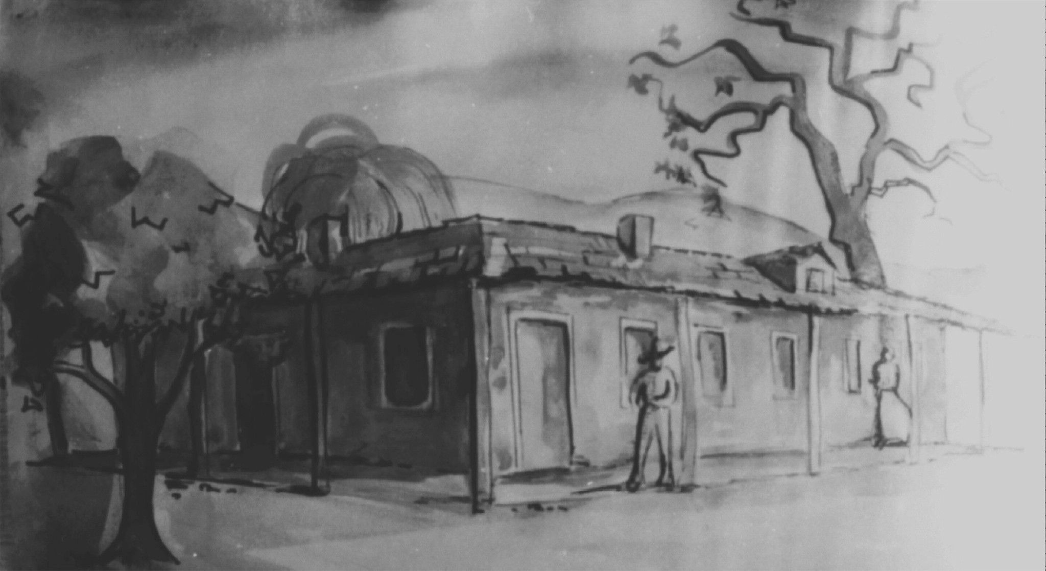 Although Bancroft (1886) only names the three patriarchs of the Mexican and Indian contingent from Abiquiu, New Mexico, we more or less know the names of about 26 family members, who probably came with them. All of these families remained in California following their arrival at Mission San Gabriel in the southern part of the province. Antonio Armijo, the trailblazer of 1829, was already there in northern California with his father, working a land grant called the Tolenas Rancho. The Pena and Vaca families became partners and petitioned for a grant of their own, afterwhich they proceeded north on the El Camino Real to become Armijo's neighbors on what came to be called the Los Putos Rancho. The Gordon family, and John Reid Wolfsill, a younger brother of trailblazing pioneer William Wolfskill, either held or soon acquired grants to the north and east of the Armijo and Vaca-Pena grants. Pencil sketch drawn prior to 1877 by Nathan Coombs, Sr. of the Armijo Adobe on the Tolenas Rancho. It is the only known likeness of the adobe, which once stood where the Rancho Solano Golf Course is today.