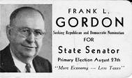 Frank Leslie Gordon I (1867-1955), the son of William Henry Gordon and Julia Etta Chapman, was born on June 11, 1867 at the Gordon Ranch in Gordon Valley, Napa County, California. He married his first wife Jennie E. Suggs (1875-1894) on Nov. 8, 1893 in Suisun Valley, but little is known of her beyond her marriage, and the birth and death years inscribed on her tombstone at Rockville Cemetery, Solano County, California. Frank then married his second wife Alice Antoinette Gosling (1874-1955) on Oct. 30, 1898 at her parents house in the Berryessa Valley, which is now beneath the Lake Berryessa Reservoir. He became a politician, and sought in 1932 both the Republican and Democrat nominations for California State Senator, ultimately serving from 1933 to 1949 as Senator for the 11th District (Napa County). He died on Jan. 31, 1955 in Saint Helena, California, and is buried with both wives in Rockville Cemetery.
