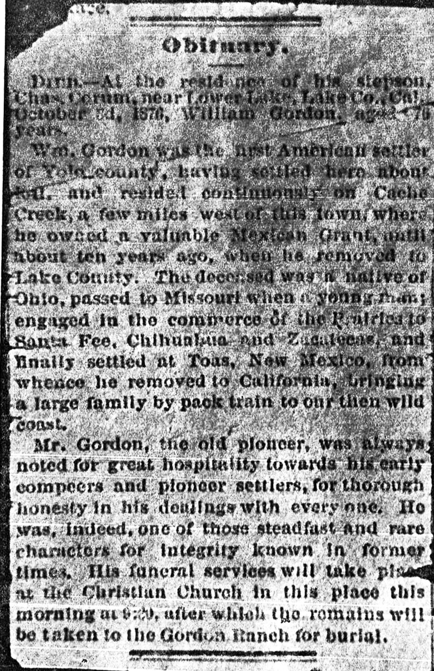 William died on Oct. 3, 1876 at Cobb at the home of his stepson Charles Corum. Some rumors put his burial place at the foot of Windy Mill Road on the east side of Boggs Mountain. However, there is a headstone for him in the Gordon Cemetery, which is a private family cemetery that is located in a somewhat remote area of farm fields on the north bank of Cache Creek in Yolo County, more or less between Esparto and the Watts-Woodland Airport. Also, there is an obituary for William from an unknown newspaper, which states that his service was held at a local church with his remains "taken to the Gordon Ranch for burial" (please see the newspaper article to the left). Because this article names the Gordon Ranch, and not the Corum Ranch, this almost certainly puts William's final resting place at Cache Creek.
