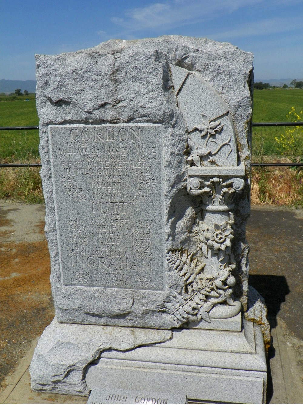 Margaret Gordon (1841-1882) was born on Dec, 17, 1841 at the San Cabriel Mission in California. She is said to be "the first white child born in the state" (History of Solano and Napa Counties, p. 822). She married Robert Edward Tutt (1838-1913) on Jan. 14, 1858 in Yolo County, and they had several children, most of who were born in Cottonwood, a former settlement near Madison in Yolo County. She is buried in the Gordon Family Cemetery with five of her children, four of whom predeceased her. Her husband lies in the Capay Cemetery in Esparto.