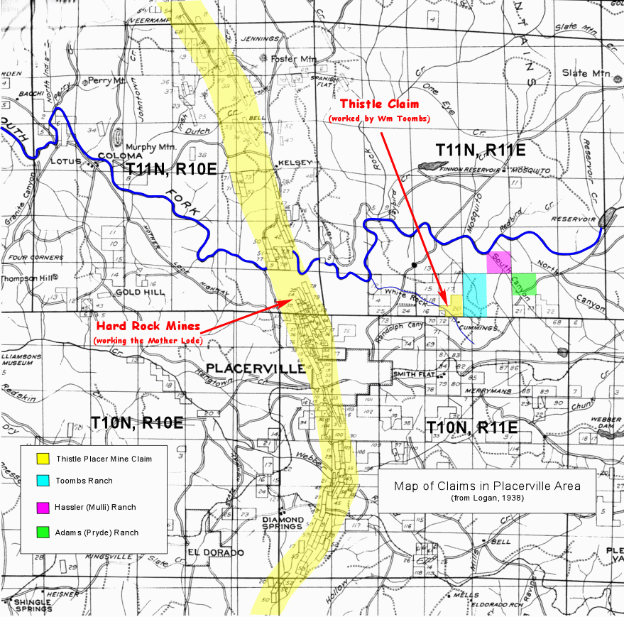The Thistle Placer Mine that William Toombs owned is in the Deep Blue lead, which snakes along near the southwest side of the old Toombs ranch. The location of the mine is shown on Plate 2 in the California Journal of Mines & Geology, v. 34, No 3, and the Map Reference for it is 38°45'16"N by 120°44'57"W (38.75440, -120.74920). The claim is located where lava, actually the volcanic breccia of an ancient mud flow, partially covers the channel, which here is only about 30 feet wide and 12 feet thick as it runs along beneath beneath the lava cap. The actual mine may have been a shaft that pierced the lava cap to reach the gravels beneath. Then the shaft probably pierced through the gravels to reach to the underlying bedrock, where William could work the lowermost, richest part of the ancient stream bed - gravel-filled cracks on the surface of the bedrock being the best places to find concentrations of gold. The mine may have also been a drift (horizontal tunnel) that started at the edge of the lava cap, then dug along beneath the volcanic cover to reach the hidden Blue Lead gravels. William no doubt worked several claims during his forty some years in the gold fields, but the Thistle Mine appears to be the one that he concentrated on in his later years.
