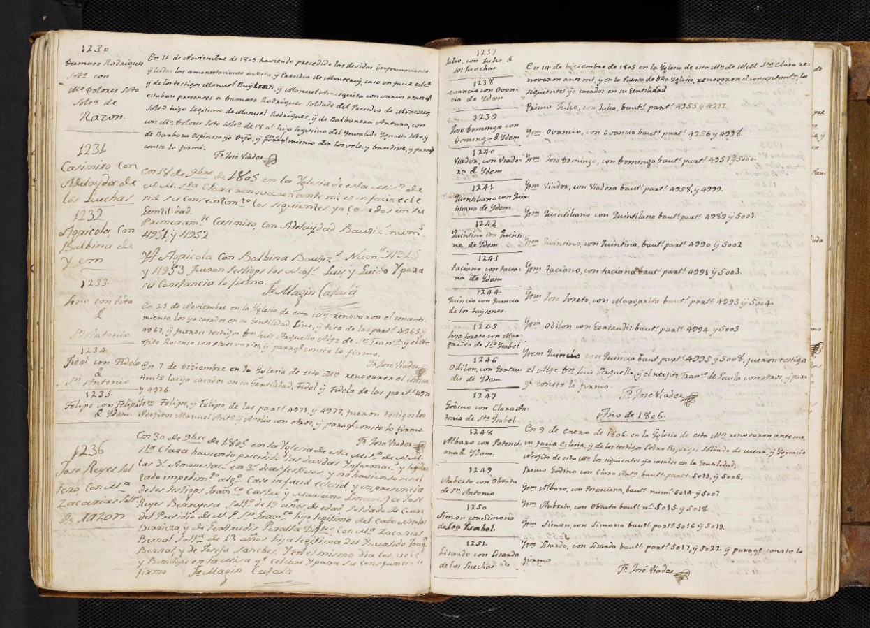Damaso Antonio Rodriguez (1782-1847), the son of Manuel Rodriguez and Maria Valvanera (Balbanera) Antuna, was born Dec. 11 1782 in Alta California, and baptized by Father Junipero Serra four days later on Dec. 15 at the Carmel Mission in Monterey. His full name was Jose Damaso Tomas Antonio Rodriguez. He became a soldier at the Monterey presidio, and married Maria Dolores Soto (1790-1826) at the mission on Nov. 11, 1805. Although Maria is listed in the mission records as being 18 at the time (the page with her marriage record is shown on the right - it is entry #1230 on the left page), her baptism date was May 30, 1790 at the Santa Clara Mission, which implies she might have been even younger. Maria was the daughter of Ygnacio Soto (1749-1807), a Spanish soldier who came to California with his wife Barbara de Espinosa (1759-1797) and three children with Juan Bautista de Anza's expedition that arrived at Monterey in January of 1776, and pressed on a few months later to found San Francisco. Although it is quite speculative, the Soto lineage supposedly can be traced back to a Spanish ancestor born in the early 1600s.