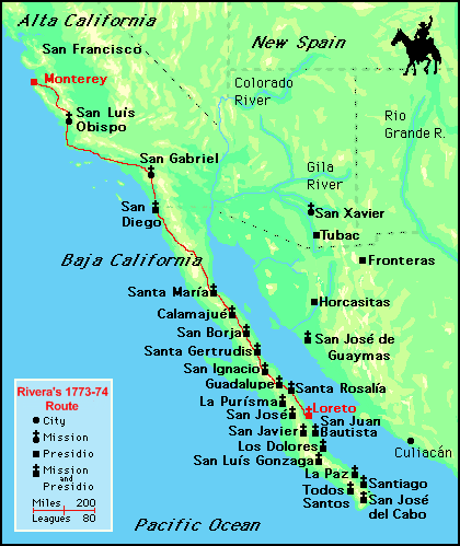 [1] Capt. Fernando Rivera y Moncada was appointed military governor of California to replace Pedro Fages, with whom Father Junipero Serra had quarreled. Rivera left for California late in 1773, traveling via Guadalajara (where Rivera had a small farm), Tepic, and Sinaloa, to recruit fifty or so settlers in route. Sailing across the Gulf of California from the mouth of the Yaqui River, he arrived in Loreto, on the Baja Peninsula, in early March of 1774. Thence he rode horseback the entire distance from Loreto to San Diego, close to 600 miles, where he arrived on March 23 or 24, 1774. (From The California State Military Museum.)