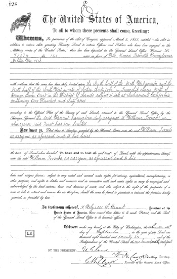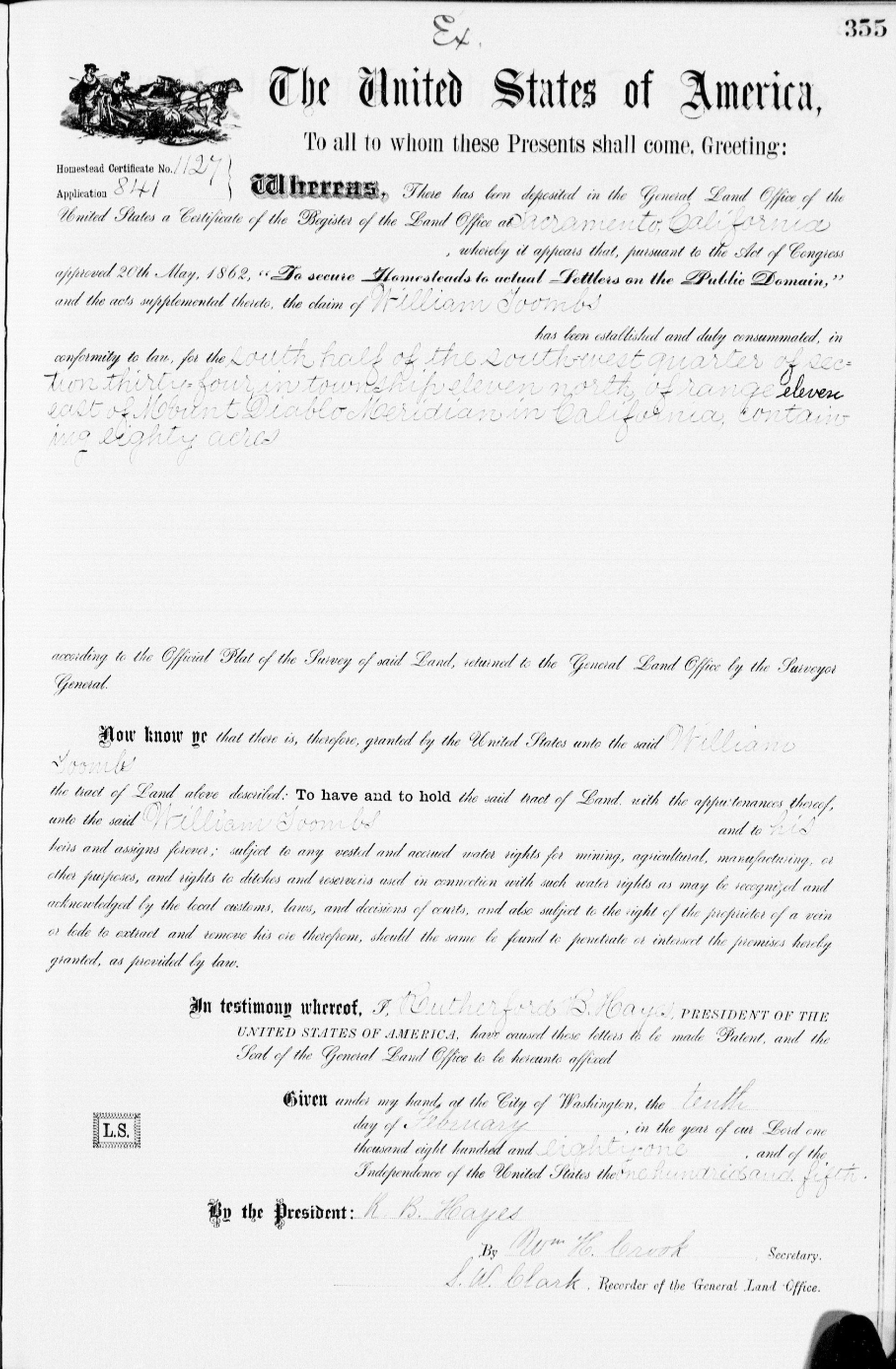 Whereas, there has been deposited in the General Land Office of the United States a Certificate of the Register of the Land Office at Sacramento, California , whereby it appears that, pursuant to the Act of Congress, approved 20th of May, 1862, "To secure Homesteads to actual Letters on the Public Domain," and the acts supplemntal thereto, the claim of William Toombs has been established and duly consumated in conformity to law, for the south half of the southwest corner of section thirty-four in township eleven north of range eleven east of Mount Diablo Meridian in California containing 80 acres
