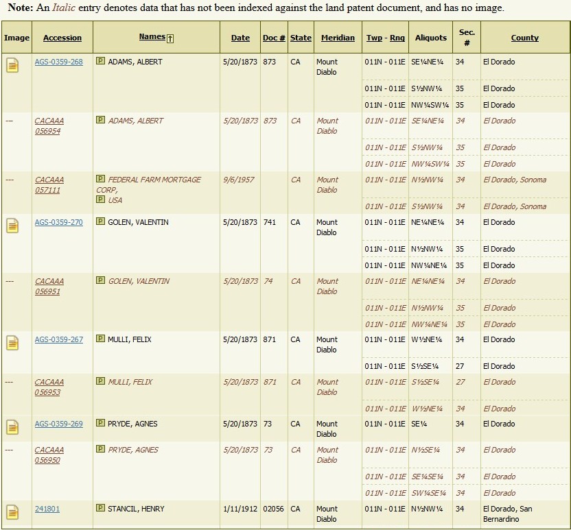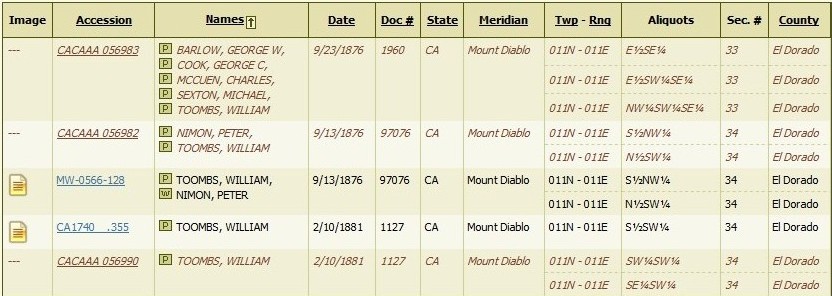 William Toombs, Sr. was also a co-owner of the Thistle Placer Mine, in the SE/4 of Sec 33-T11N-R11E, which was located just to the west of his White Rock Canyon home. He and four partners, one of whom was his son-in-law Michael Sexton, were awarded a patent (full ownership) on Sept. 23, 1876 to the 110-acre claim (Land Office Doc ID #1960). The Toombs family in 1905 still owned the mine when we read that "the Toombs boys property at White Rock has been bonded for $15,000 to C.E. Seymour." Presumably the "Toombs boys refers to William's sonsW illiam Louis Toombs and Charles Gilbert Toombs. The tables shown below are from the website of the Federal Bureau of Land Management, and show the Toombs family land grants, with neighboring Federal land grants.