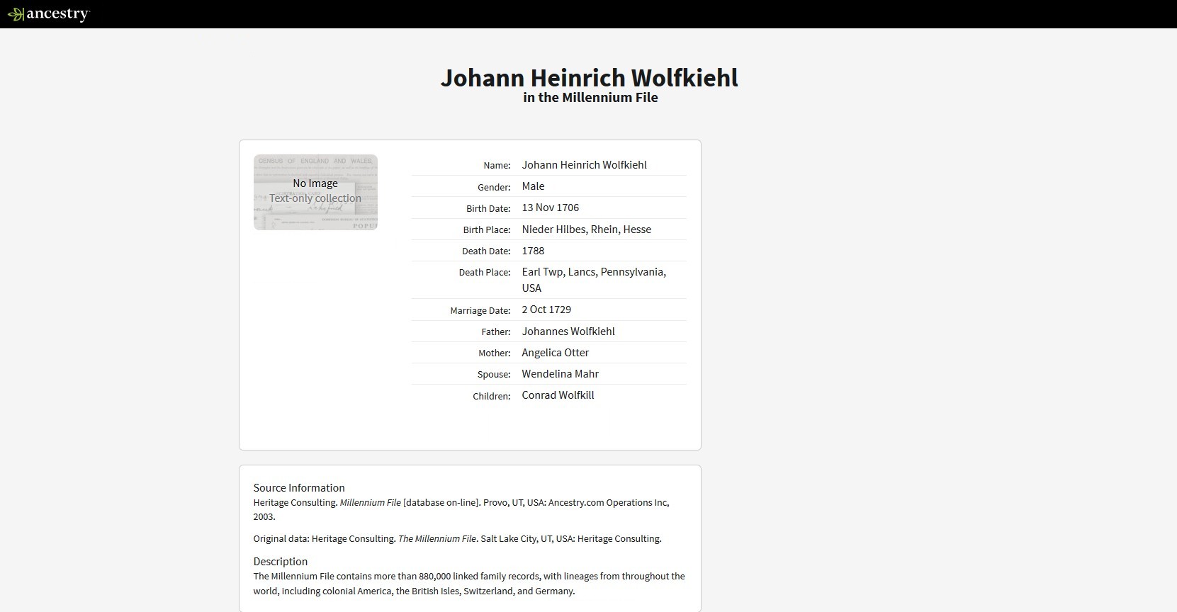 We do not know when or where Johannes was born and died, but several family tree websites give him the name Johann Heinrich Wolfkiehl with a birthdate of Nov 3, 1706 in Nieder Hilbersheim, Rheinhessen, Hessen, Germany (some give Dec 10, 1712 as the date). They also assign him a death date of June 12, 1787 in Earl, Lancaster County, Pennsylvania. Unfortunately, the source of this information is the Millennium File on Ancestry.com, which is a database created by the Institute of Family Research (which no longer exists) to track the records of its clients and the results of its professional research. Because these records include material submitted by clients, without sources and with no check on validity, it may include unverified information that is the result of guesswork. For this reason, the Millennium File is a questionable resource that is no substitute for original sources. That said the birthdates of 1706 and 1712 for Johannes from this file are inconsistant with his stated age of 46 on the 1742 roster for the Loyal Judith, which would give ~1696 as his birth year. We suspect that Johann Heinrich Wolfkiehl is actually an inaccurate merging of the two Loyal Judith passengers Johannes and Heinrich. Is Johann Heinrich Wolfkiehl the same as Joseph Wolfscale, the German emigrant of the aforementioned Wolfskill family stories, is he a relative of Joseph, or is he no relation at all? We do not know the answer.
