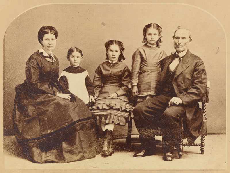 Photo taken about 1869 or 1870 (left-right) of Mrs. Susan Wolfskill, Frances Ann "Fannie" Wolfskill (1866-1934), Malinda "Linnie" Tate Wolfskill (1860-1929), Virginia "Jennie" Lee Wolfskill (1864-1870), and Mr. John Reid Wolfskill. Not shown are Nellie (1862-1863), who died young, and Ned Wolfskill (1850-1939). (From the California State Library)