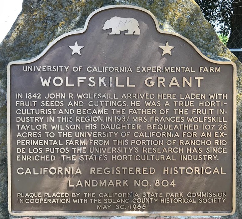 Historical Landmark at the Wolfskill Experimental Orchards. It reads, "In 1842 John R. Wolfskill arrived here laden with fruit seeds and cuttings. He ... became the father of the fruit industry in this region. In 1937 Mrs. Frances Wolfskill Taylor Wilson his daughter bequeathed 107.28 acres to the University of California for an experimental farm."