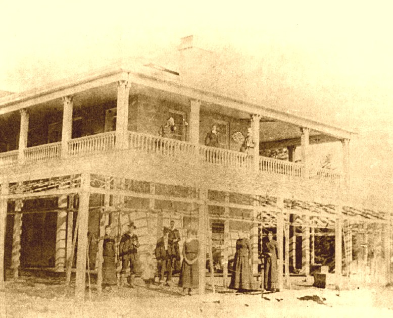 Photo taken in 1883 of the Wolfskill ranch house on Putah Creek near Winters. John Reid Wolfskill is standing third from left in front of the house, which was destroyed on April 19, 1892 by the Winters Earthquake. and replaced by another house that later burned down. This site today is part of the Wolfskill Experimental Orchard that is administered by the University of California at Davis.