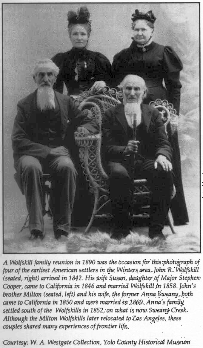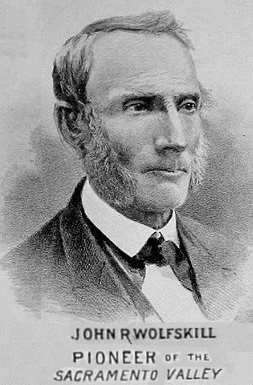 John Reid Wolfskill (1804-1897) was born on Sept. 11, 1804 in Madison County, Kentucky, and followed his brother William west by going first in 1828 to Santa Fe, New Mexico, and then in Feb. 1838 to Los Angeles, California. William, who had Mexican citizenship, obtained for John from the Mexican government on May 24, 1842 a grant of land in an area that eventually became part of Solano and Yolo counties. Though this grant was in William's name, it was occupied by John, who built a large hut of cut saplings and tule grass on the south bank of Putah Creek in what today is Solano County. He lived for several years in this place, which he called the "Old Tule House", until he replaced it with a wood frame structure sometime after the discovery of gold at Sutters Mill. He and his brother Mathus as the original land holders are also associated with the 1875 founding of the nearby town of Winters, close to John's house, but on the north side of Putah Creek in adjacent Yolo County.