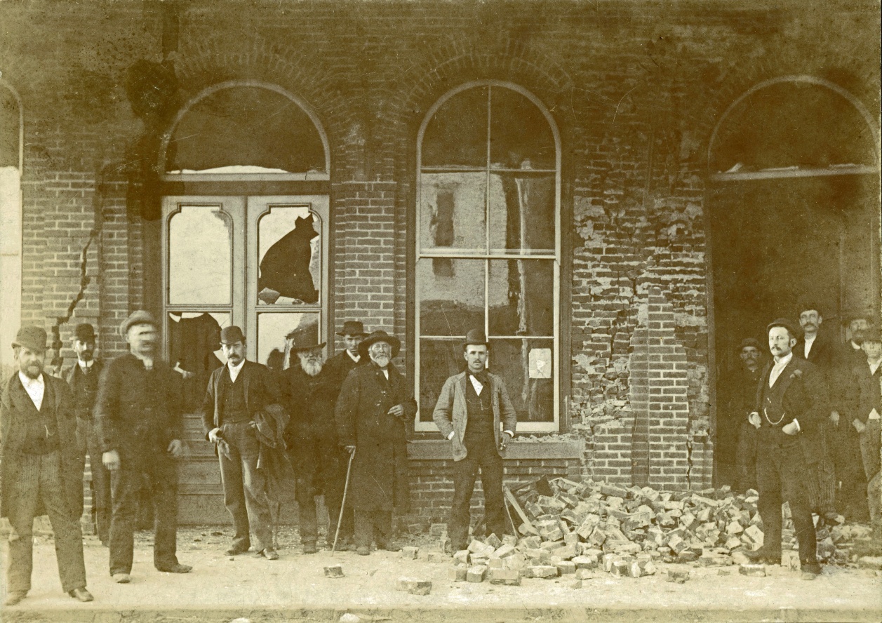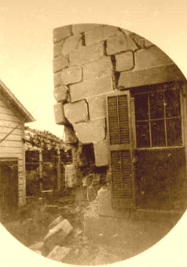 The Winters EarthquakeThe Old Stone House that John Reid Wolfskill built was severely damaged on April 19, 1892 by a 6.4 Magnitude earthquake, which was followed two days later on April 21 by a 6.2 Magnitude aftershock. No one lived in this house ever again, and it was soon torn down and replaced by the house described in the next section below. The tremblors that toppled the Old Stone House were called the Vacaville–Winters earthquakes, and they were felt throughout the San Francisco Bay and Central Sacramento Valley areas. But damage was greatest in Winters, where the amount of destruction indicates an earthquake intensity of IX (violent) on the Modified Mercalli scale. Although the cost of damage from these twin quakes was estimated at $225,000 to $250,000 (very high for those days), only one person was killed. No surface faulting or rupture seems to have resulted from either quake. Shown below on the left and in the middle are photographs of the damaged house, and a third photo to the right taken by photographer Walter G. Hemenway, a Wolfskill family relative, shows damage to the historic Hotel DeVilbiss in nearby Winters. The DeVilbiss today houses the well-known Buckhorn Saloon and Restaurant.