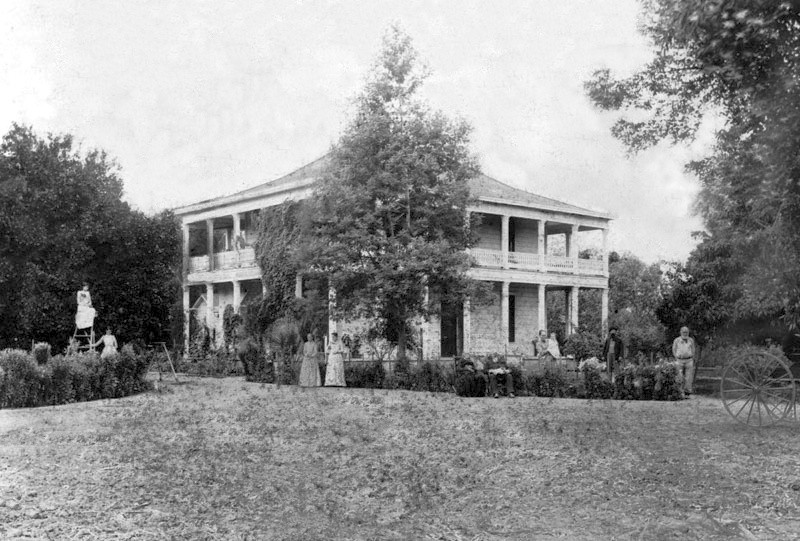 The Mathus Wolfskill HouseMathus Wolfskill was the first of John Reid Wolfskill's younger brothers to join John in California at the Putah Creek Rancho - Mathus arriving in 1850 after crossing the plains with his family in a covered wagon. John set Mathus up with a large plot of land on the north side of Putah Creek, and here at the Putah Creek crossing near the present town of Winters Mathus about 1852 built an adobe house for his home. Mathus then relocated with his son Joseph Cooper Wolfskill in 1866 to Suisun Valley, where he lived with Joseph in the Wetmore House, and later in a two-story Victorian mansion that Joseph built in 1885 in front of the Wetmore House. Two years after Mathus made the move to Suisun Valley, he sold the old house at Putah Creek to Theodore Winters, who is credited as the founder of the town of Winters when a railroad line was extended north in 1875 across Putah Creek to reach his property. He later sold this house in 1886 to the Baker family, but it was abandoned soon after when it was toppled in 1892 by the Winters Earthquake. Dorothy O'Neill (2009, p. 37) in her pictorial history of Winters identifies the two-story house in the photo on the right as the Matthus Wolfskill house in the 1880s, with members of Baker's family standing out in front. However, the house shown here looks very similar to photos we have of Sarchel Wolfskill's house, so similar that it makes us wonder if the photo here might be misidentified?