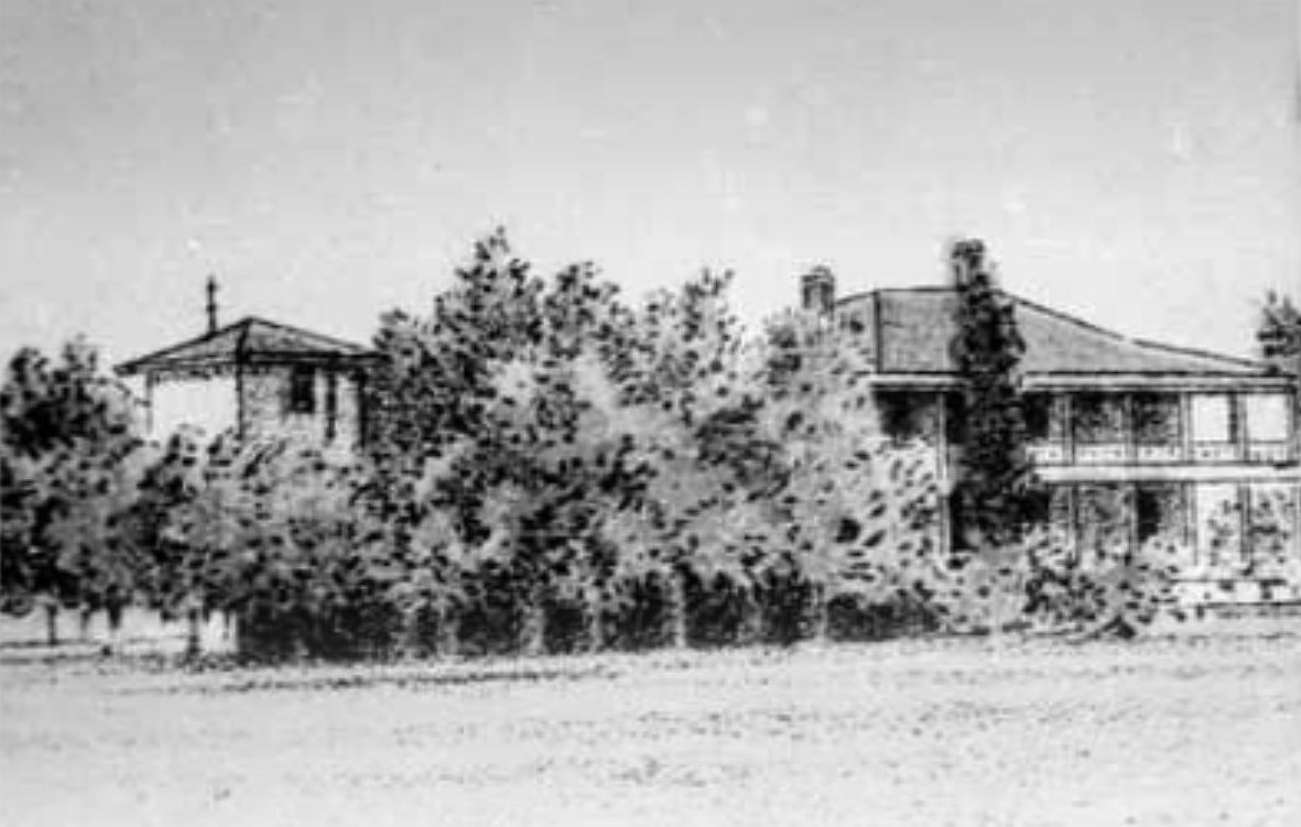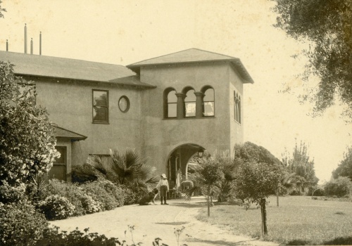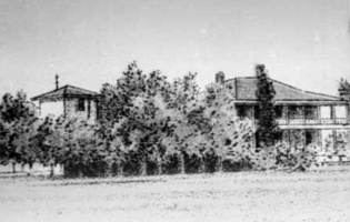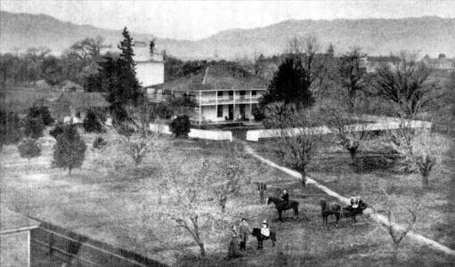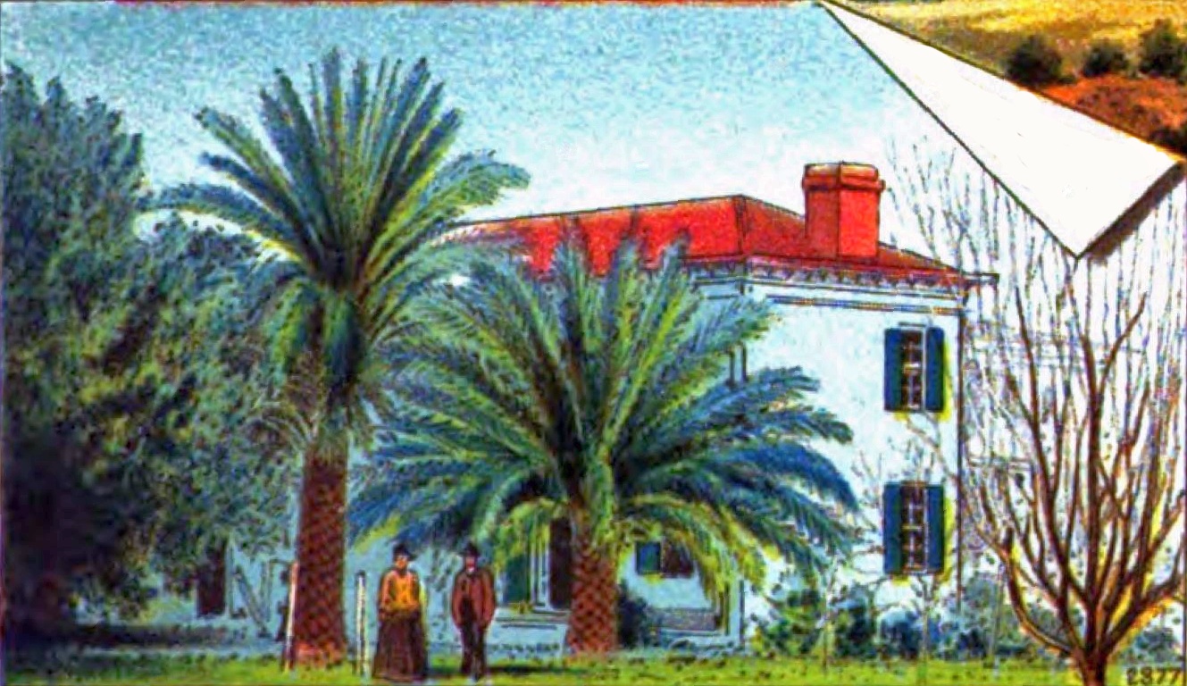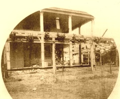 John Reid Wolfskill in 1861 began building a new house made of locally quarried stone to replace the "Old Wood House" that he had been living in for at least the last decade. He had been sharing the old house up to that point with his brother Sarchel and Sarchel's family, but when John and his family finally moved into the new house, Sarchel received the old house for his own. The "Old Wood House" then became the Sarchel Wolfskill House, which Sarchel sometime in the 1870s apparently rebuilt and/or remodeled to his own tastes and conveniences. We have not found any photos of the "Old Wood House" in its original state when John Reid Wolfskill still lived there, but several photos survive of the house after its ownership passed to Sarchel. Third House - The Old Stone HouseThe third house my father built was a beautiful stone house built of stone quarried in the hills at the S.W. corner of the Rio de los Putos Ranch, Solano county, California. He secured a stone mason, had him examine the stone as to its condition for building material, and upon the stone masons report he decided to erect a house for himself of that material. The stone mason quarried the stone, faced and prepared it for the erection of the house. Those stones that were exposed to the outside walls of the house were dressed and presented a very neat and substantial appearance. The cornice, was of redwood timber blocks painted and sanded while the paint was yet fresh and the sand adherring gave a sandstone finish which was very ornamental yet very plain and was such as was permitted repainting and sanding which refreshed the cornice and it appeared as a new cornice. The windows were large and plentiful. The doors were convenient and placed where necessary. There was a veranda on three sides of the building up stairs and down. The small bedchambers were entered from the veranda and provided with door windows where necessary. The windows and doors were so arranged they provided a draft or ciculation for all rooms during the hot season of the year. There were large living rooms, large dining room, kitchen, pantry, and four fireplaces. The fireplaces were beautiful as in their construction, there was one solid stone for the back of the fireplace, one solid stone for the throat or where it entered the flu, one each solid stones for the jambs, one solid stone for the arch, and one solid stone for the immense hearths. It was a beautiful and durable house and provided with arrangements for such comfort and convenience. It was a grand old structure and provided a beautiful home. The four main rooms were immense. They were on the main portion of the building, one immediately above the other. The bed chamberts were on the L, as well as the dining room kitchen and pantries. [Ned Wolfskill notes in a caption on the back of a photo of the house that is shown below that the house was an "L shape".] The four bedchambers were on the second floor and were all very large and comfortable. The main entrance was from the north, but owing to the violent north winds that entrance was abandoned and all conveyances came to the south end of the house where the kitchen and dining rooms were located. The main entrance was into or in a portico to the front door, leading into the main hall which contained a winding stair with a beautiful mainpost which the railing of the stairs was securely attached. This winding stair permitted you to reach the upper floor from the inside of the building, an outer stairs provided communication with the outside or veranda. All the rooms up stairs had entrances from the veranda. The portico was floored or decked and ceiled and supported by columns, which were painted and sanded which produced a beautiful effect. The front entrance was of a beautiful effect and it was unfortunate it could not or was not utilized. I think the most elaborate gathering on that old front entrance was the wedding of my youngest sister Fannie to Mr. Taylor. The dancing platform and accommodations for visitors was on this platform on the north side of the house and this portico furnished seats and a complete view of the couple dancing on the platform beneath. This stone house was thown down by the earthquake of 1892. It was never reoccupied. Mr. Tyalor built the present house on the site of the old stone structure. Ned Wolfskill