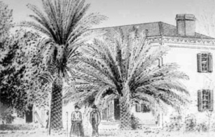 Second House - The Old Wood HouseThe second house or residence my father built on his property, Rancho Rio de los Putos was near the site of the Old Tule House, and was a frame building of lumber and much of this lumber came from the Atlantic coast around Cape Horn. The boards for flooring and ceiling were assorted lengths and widths, from four and trenty-four inches in width, and six to twelve feet in length. These boards were interspersed with knots and when the lumber became throughly seasoned these knots dropped out and left a hole, some of which were as much as two inches in diameter. This second house had modern doors of panel build, window sash with plate glass, and such other equipment as could be gotten hold of at that time. Of course it was some little time before the floors were covered with carpet. I remember the window shades were suspended from the top and, to afford more light these shades were suspended from the top and secured to one side of the window. Many houses in those days had no window shades. I remember as a temporary substitute for a broken pane of glass, a pillow was used, being stuffed in the opening in the absence of the glass. The dining room for this second house was forty or fifty feet from the residence and it was a frame building and much of the studding and ceiling joists were of straight willow cedar saplings, one side faced so as to furnish face for ceiling. [Ned in this passage is probably describing the kitchen and not the dining room.] The material for this second house was hauled from Benicia, which required several days to make a trip for material, and the material would have to come from San Francisco, or other places where it was manufactured. Such improvements in those days were made under difficulties. I remember it was several years before a fireplace was provided for the house. It was a brick structure the brick being hauled from Sacramento. A brick mason to build us such a structure away from cities was difficult to find and one had to go to the country for a small job was almost impossible to find. Finally a man was found and he built the fireplace. He arrived on the scene and improvised a mortar box and my father secured an Indian to serve the mason with mortar and brick. The Indian carried the brick in a sack and mortar in an iron pot or kettle, as we had no buckets except wooden buckets and a wooden bucket wouldn't last long for either brick or mortar, and this was before the age of G.I. buckets. This was the first firelace in northern Solano County. My father occupied this house until 1861, when he completed the Old Stone House on Rancho " Ned Wolfskill