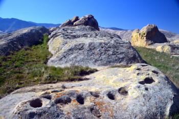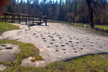 Indian Grinding Rock State Park (Amador County) sits on an ancient village site of the Sierra Miwok. A museum here has interpretive displays, Nearby is a limestone outcrop with some 1,185 bedrock mortars—the largest group in North America. Petroglyphs are associated with some of the mortars.