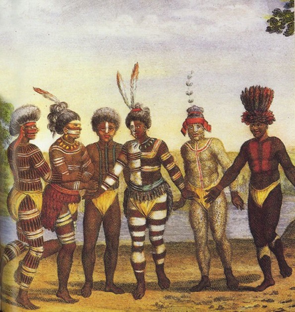 The colored print on the right, drawn about 1806 by Georg Langsdorff, shows Indian dancers at the San Jose Mission. Although the dancers shown are probably Yokut and not Southern Patwins, they are representative of what Patwin dancers may have looked like. There is also a nice 1816 drawing by Louis Choris of native dancers at the San Francisco Mission. Some dances were associated with a religion that Kroeber (1925, 1932) calls the "Kuksu cult", in which members of a male secret society performed rituals, while wearing disguises to impersonate mysterious figures from the spirit world. This cult is named for the Kuksu spirit that they impersonated most often. Many Kuksu dances, especially those associated with male puberty rites, were held in private ceremonial lodges and performed only for members of the cult. However there were also public dances held outdoors to celebrate bountiful harvests, the passing of the seasons, and so forth, as well as war dances, rain dances, and the like. These features characterize the Kuksu cult: