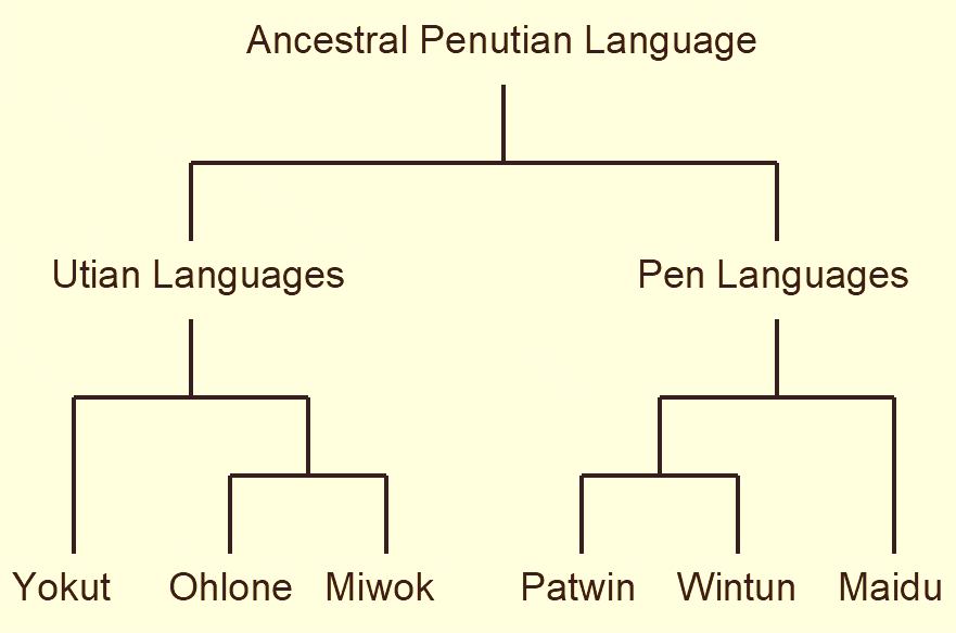 The Bay languages of Patwin, Miwok, Yokut and Ohlone belong to the Penutian language family. Also, the languages of the Wintun and Maidu, which are found in the northern Sacramento Valley, are Penutian also. Two non-Penutian languages are found in the nearby northern Napa Valley - one being Pomo, which is a Hokan language, and the other being Wappo (Guapo), which is Yukian. The Patwin tongue of the Suisun Indians, together with Wintun and Maidu, all belong to a Penutian sub-group in which the word "pen" designates the number "two". By contrast, Miwok, Ohlone and Yokut belong to a different Penutian sub-group in which "utia" is the word that designates the number "two". There is a chart below that shows these relationships. These languages are different enough from each other that speakers of one would not have been able to easily understand speakers of the other. We are not linguists, but to give some examples, we can probably compare these Indian languages to some modern European languages. For eample, the Patwin language of the Suisun Indians is perhaps as different from Wintun as French is from Italian, and as different from Maidu as French is from Spanish. Then Patwin is perhaps as different from Miwok as French is from Romanian, and as different from Wappo (Guapo), which is a Yukian tongue, as French is from Greek. There are three different dialects of the Patwin language, each dialect differing from the others by slightly different pronounciations. However, the words are not so different as to limit the speaker of one dialect from understanding the speaker of another. The Suisune and their immediate Patwin neighbors spoke the Southern Patwin dialect, whereas Patwins to the far north of them spoke Hill Patwin and those living along the Sacramento River, such as the Yolos, spoke River Patwin. The Miwok villages of the Ompins, Chupcans, Bolbones (Volvon) and others, who lived just south of the Suisune, spoke the Bay Miwok dialect of the Miwok language, whereas various other Miwoks spoke either the Coast Miwok, Plains Miwok or Sierra Miwok dialects of the same language. The Southern Patwin dialect became extinct in the 1920s when the last of the native speakers died. Possibly the last person to understand the language was Dr. Platon Vallejo (d. 1925), the son of General Mariano Vallejo, who of course was not Patwin, but Spanish. However, Platon was taught the Suisun language as a boy by his companion and mentor the Suisun Indian Tomo (d. c.1860). He compiled vocabulary lists of Suisun words, and it is from these lists that various authors over the years have tried to assign meanings to place names believed to be of Suisun Indian origin. One of Platon Vallejo's word lists is reproduced in Kroeber (1932), which is available in the link below. He also lists a few Suisun words in his 1914 article "Memoirs of the Vallejos".