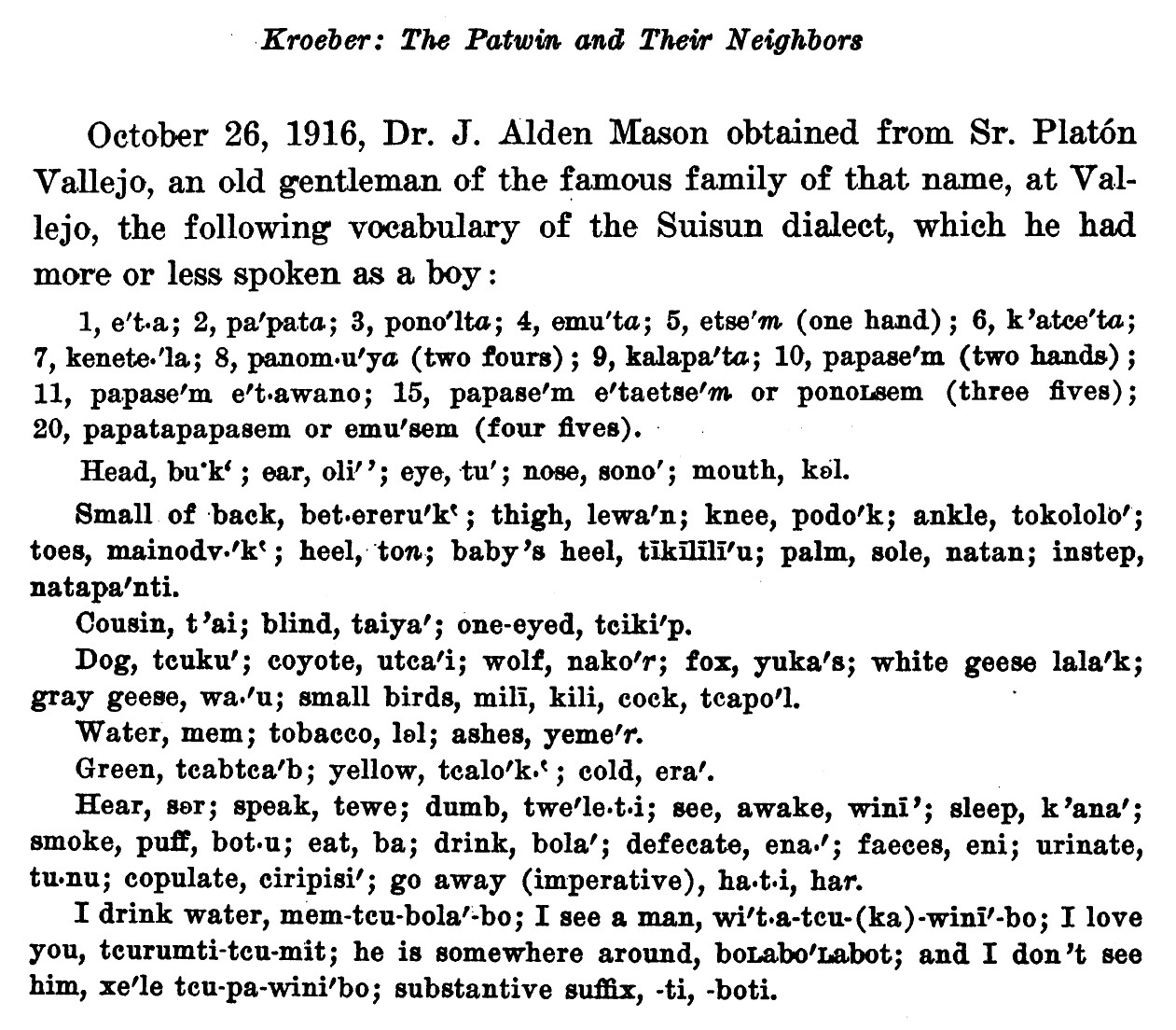 The language of the Suysun Indians was very far from being the primitive speech of savages. Rather it was the tongue of a people with a lively, joyous, poetic imagination, with a deep love of nature and a true perception of the beautiful. Therefore, it was of a necessity expressive, with a fairly full vocabulary. Once in a while, to keep my hand in, I amuse myself by writing Suysun. I find that I can readily translate any ordinary book into this Indian dialect. Recently I translated the Lord's prayer with signal success.